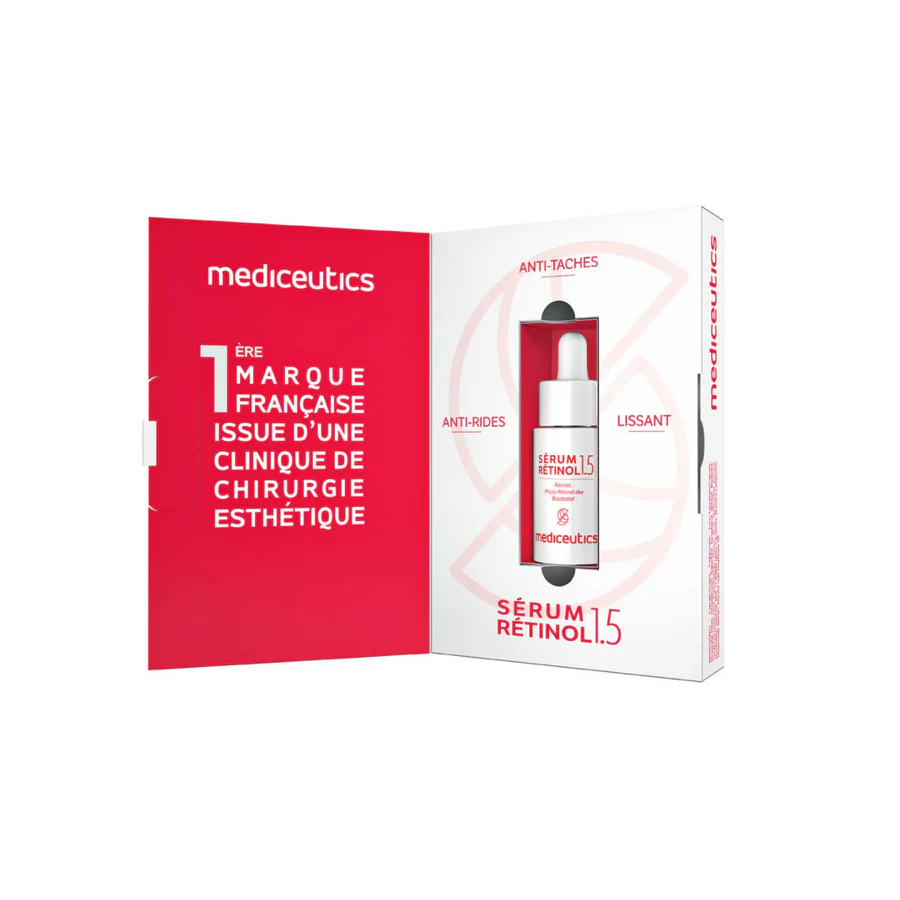 El complejo único RETINOL 1.5 MEDICEUTICS® permite utilizar un retinol puro más eficaz y menos irritante. La eficacia maximizada se obtiene combinando un 0,3% de retinol puro con un 1,2% de bakuchiol, mientras que la mejor tolerancia cutánea se obtiene asociando estos activos de alta eficacia a una mezcla biomimética optimizada a base de bisabolol antioxidante calmante, bioceramidas restauradoras de lípidos y fitoesteroles emolientes.
